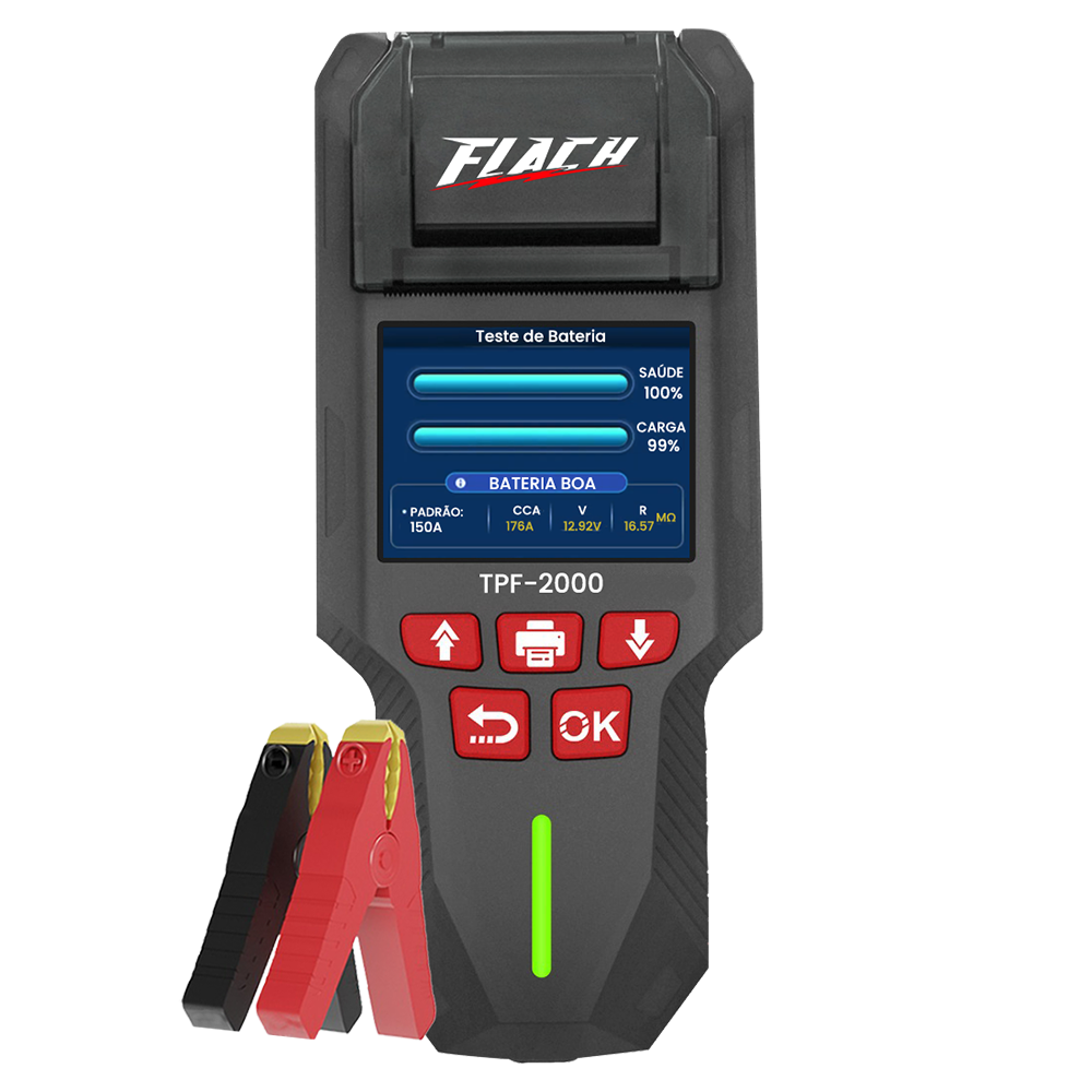 O Flach TPF-2000 é um testador de baterias profissional e multifuncional, indispensável para oficinas, auto elétricas e lojas de baterias que buscam precisão e rapidez no diagnóstico automotivo.